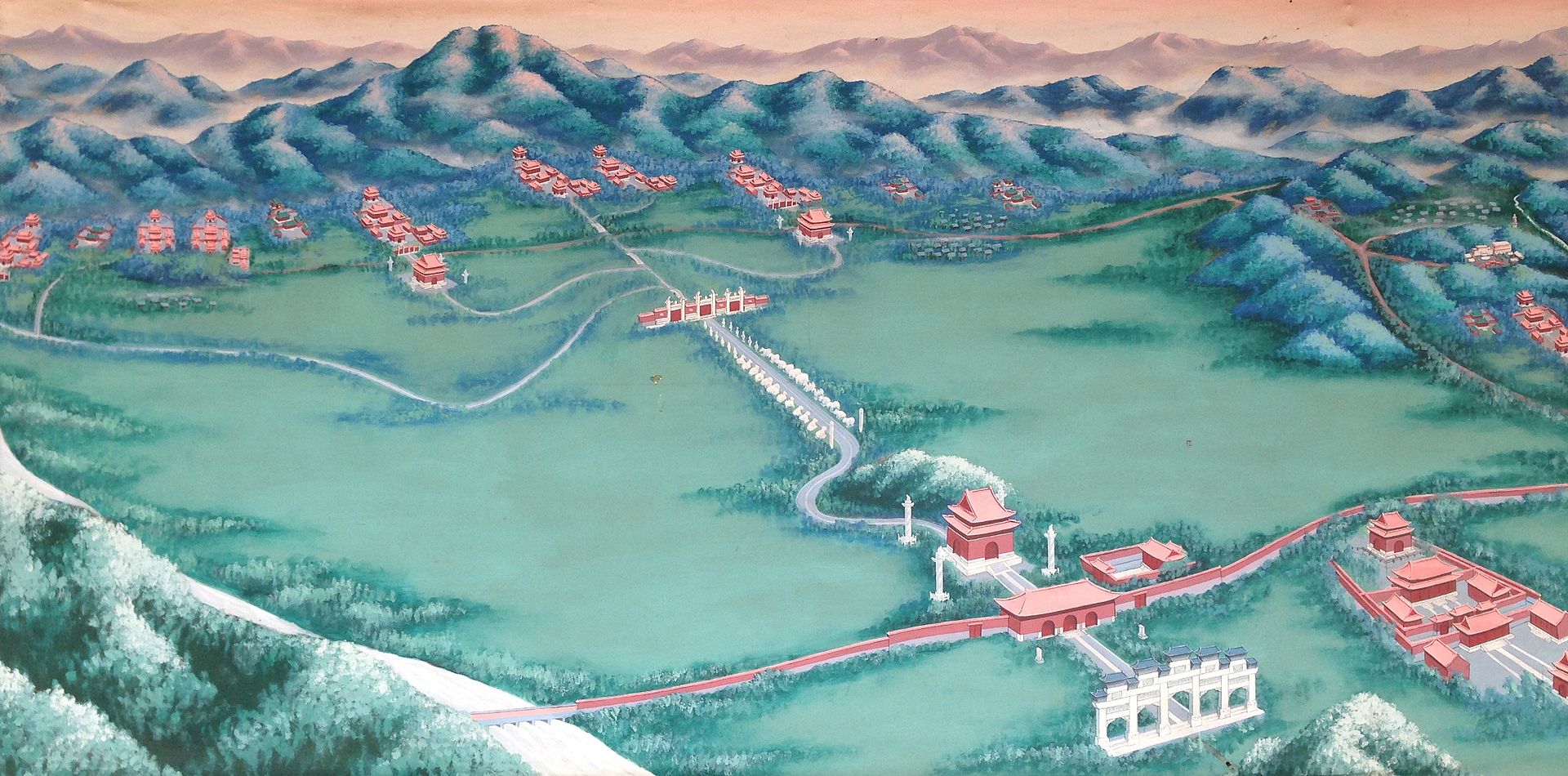 V oblasti velkolepých císařských hrobek se nachází mnoho nádherných budov. Ty představovaly nejvyšší architektonickou a uměleckou úroveň své doby. Kamenný oblouk, budova s pěti otvory, šesti sloupy a jedenácti střechami, je nejširší v Číně. 6000 metrů dlouhá hlavní posvátná cesta k hrobce Xiao Ling zůstala nedotčena. Podzemní palác hrobky Yu Ling s mnoha nádhernými a živými rytinami na buddhistickou tématiku je známý jako "slavnostní podzemní buddhistická síň".