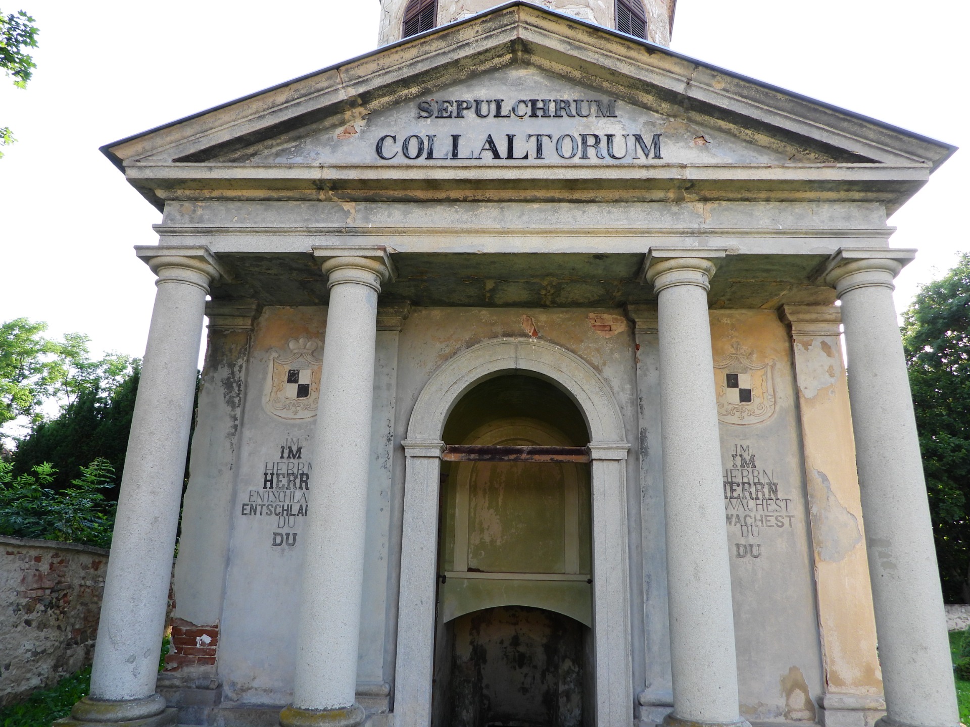 Portikus je tvořen nízkým tympanonem a nepříliš zdobným architrávem podepřeným čtyřmi dórskými sloupy.55
