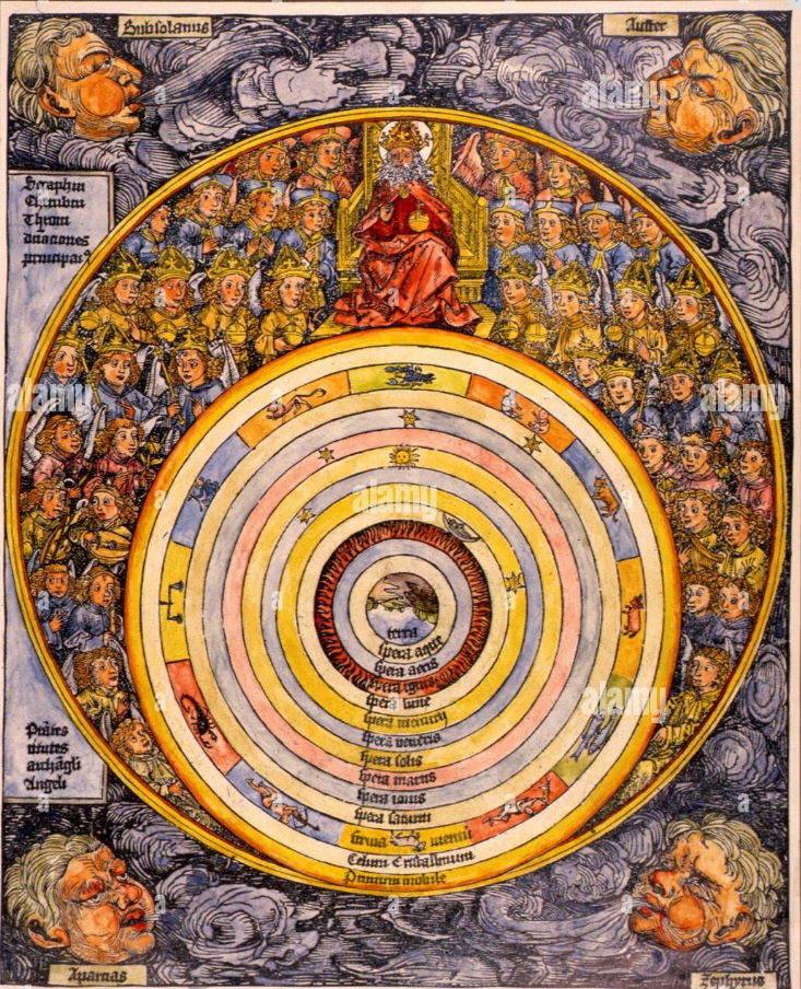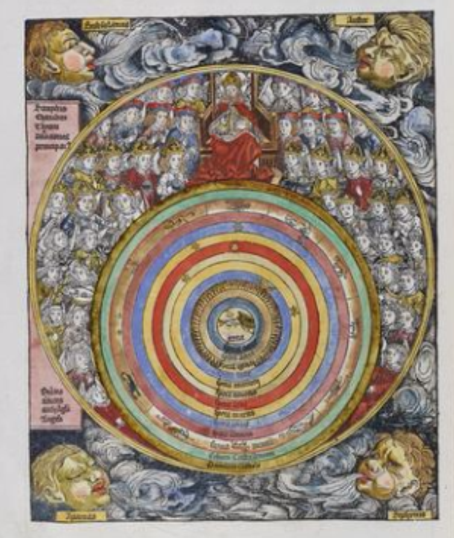 Posvěcení sedmého dne stvoření, Norimberská kronika (s laskavým svolením knihovny Cambridgeské univerzity). Křesťanský kosmos je zobrazen s antropomorfním ztvárněním Boha Stvořitele a řídí se geocentrickým modelem navrženým řecko-egyptským astronomem Claudiem Ptolemaiem ( cca 100 n. l. – cca 170 n. l.).