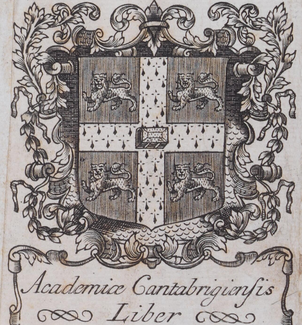 Obrázek zobrazuje heraldický znak Univerzity v Cambridgi s doprovodným textem, který naznačuje jeho spojení s knihou z univerzity.